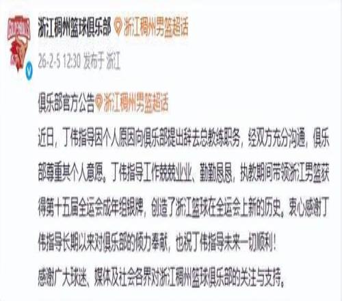 2月5日,浙江男籃官宣丁偉辭去總教練職務(wù)。這一次,CBA圈內(nèi)沒(méi)人感到意外——這已是他在浙江的第三次“下課”。