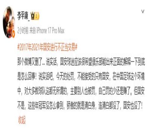 隨后,李平康又表示,“還是趕緊把事實講清楚,如果有冤情就一五一十地解釋,球迷會理解,甚至?xí)黄鹩矂?。別管別的隊說不說,國安有這個義務(wù),因為這么多年這就是北京球迷最在乎的一件事!這個時候球迷最需要的肯定是事實真相,而不是虛無縹緲的口號!”