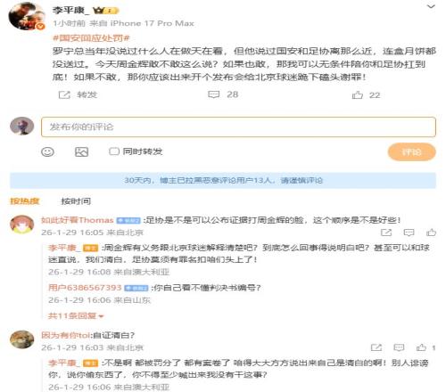 周四,在足協(xié)宣布對北京國安處以罰5分、罰款50萬的處罰之后,北京國安在社交媒體“硬剛”。媒體人李平康則質(zhì)疑道,“球迷最需要的肯定是事實真相,而不是虛無縹緲的口號!”