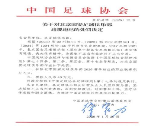 根據(jù)中國足協(xié)的罰單內(nèi)容,北京國安在2017年和2021年,違背體育道德、喪失體育精神、為謀取不正當利益進行不正當交易。 因此2026賽季被扣5分,并且罰款40萬人民幣。 |