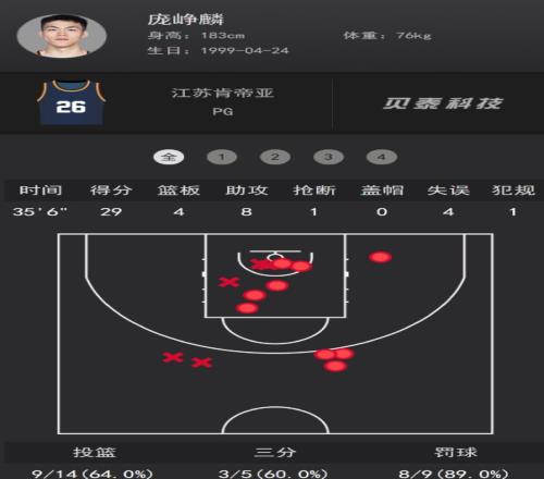 此役龐崢麟35分鐘,14中9,三分5中3,罰球9中8,拿到29分8助攻4籃板1搶斷,命中率64%,三分命中率60%,罰球命中率89%,正負(fù)值+28。 齊麟全場(chǎng)比賽29分鐘8中4只拿到12分1籃板1助攻,阿不都21分鐘6中2僅拿到6分0籃板1助攻,這兩人被龐崢麟給完爆了。