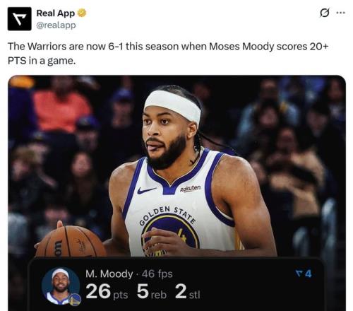 這也是穆迪過去5場傲人發(fā)揮的縮影,在過去5場比賽中,穆迪三分累計(jì)29中15,三分命中率高達(dá)51.7%。 同時這是本賽季穆迪第7次拿到20+得分表現(xiàn),當(dāng)他拿下20+得分時,勇士交出6勝1負(fù)戰(zhàn)績。