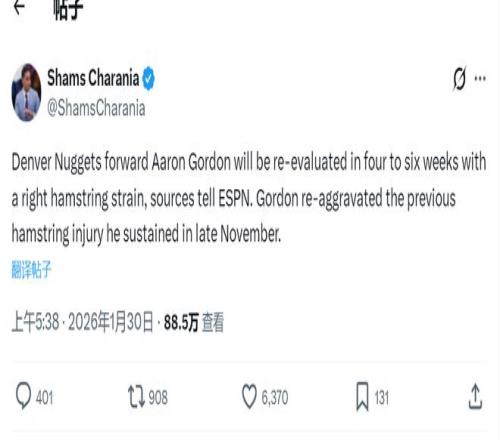 北京時間1月30日上午,據(jù)NBA名記Shams報道,掘金前鋒阿隆-戈登遭遇右腿筋拉傷,將在4到6周后接受重新評估。本賽季之初,戈登也曾遭遇右腿筋拉傷,當時他連續(xù)缺席了19場比賽。1月5日戈登復(fù)出,打了10場比賽傷勢復(fù)發(fā)。
