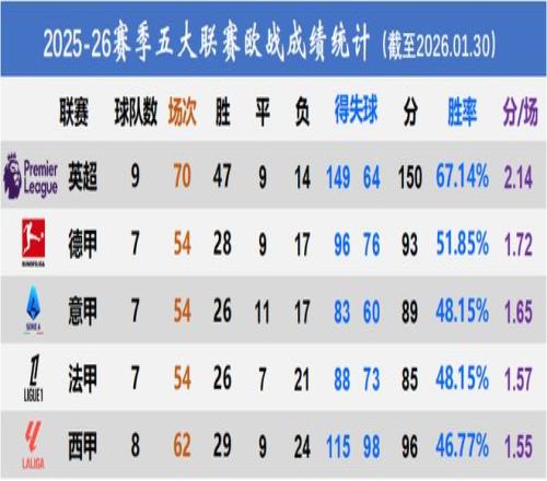在勝場(chǎng)、勝率、進(jìn)球、失球、場(chǎng)均得分方面,英超球隊(duì)毫無(wú)懸念地一馬當(dāng)先,這一點(diǎn)其實(shí)大家早有預(yù)期。不過(guò)墊底的居然是西甲,這應(yīng)該出乎很多人的意料。反而是印象中唯唯諾諾毫無(wú)亮點(diǎn)的意甲球隊(duì),竟然還能排在第三。 再來(lái)看看五大聯(lián)賽球隊(duì)之間的內(nèi)戰(zhàn)情況。