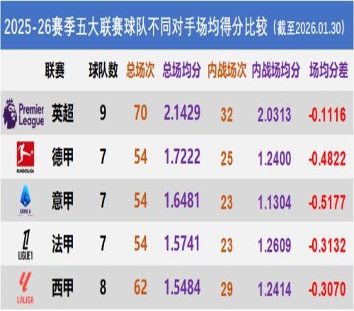 兩張圖一比較,進(jìn)一步證明了五大聯(lián)賽之間的整體實(shí)力差距。英超再次獨(dú)領(lǐng)風(fēng)騷,與第二名的差距更加拉大。意甲則符合本賽季的印象,最無(wú)存在感。 這也側(cè)面證明了“五大聯(lián)賽”果然不是白叫的,因?yàn)楦鞔舐?lián)賽的場(chǎng)均得分都出現(xiàn)了不同程度的下滑,說(shuō)明比起其他中小聯(lián)賽的對(duì)手,五大聯(lián)賽球隊(duì)還是不太好踢的。 不過(guò),面對(duì)實(shí)力更強(qiáng)的對(duì)手,各國(guó)球隊(duì)表現(xiàn)的下滑程度也是不同的。
