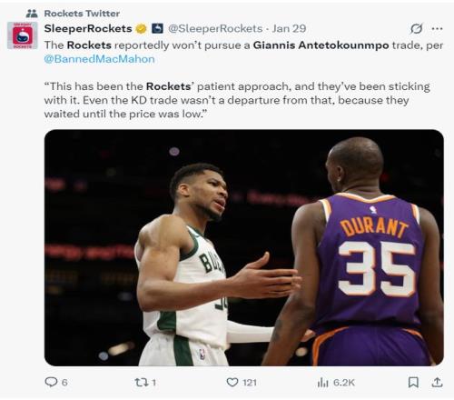 不過ESPN的記者麥克馬洪透露,火箭似乎沒有考慮交易得到揚尼斯,因為這是火箭的一貫策略,目前揚尼斯的要價太高,他們就算要出手都要等揚尼斯的要價下跌時,就跟交易杜蘭特是一樣的策略,等到價格降到最低點才出手。 |