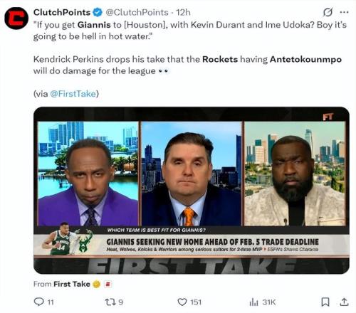 北京時間1月30日,在First Take節(jié)目中,三位名嘴談到揚尼斯的下家,帕金斯再一次建議揚尼斯空降休斯頓,他表示如果你把揚尼斯放到火箭隊,他的身邊有杜蘭特,再加上烏度卡的執(zhí)教,那將是非??植赖拇嬖?。杜蘭特與烏度卡可以最大化釋放揚尼斯的統(tǒng)治力。