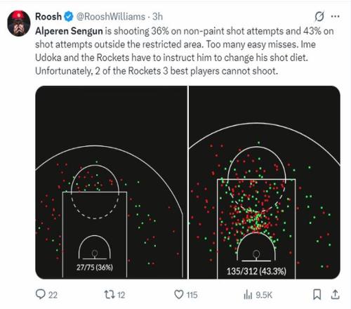 休媒Roosh寫道:申京在罰球線外的命中率只有36%,在禁區(qū)外的投籃命中率只有43%,大多數(shù)的投籃他都無法把握。烏度卡與火箭必須要求他改變投籃方式,更不幸的是火箭隊內(nèi)有三位最佳球員其中兩人不會投籃。
