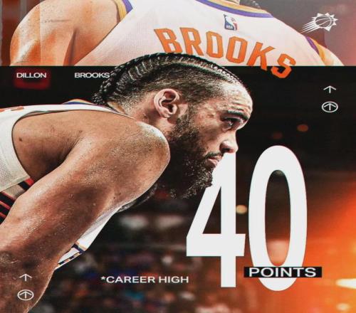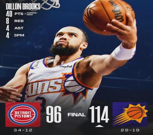 北京時間1月30日,NBA常規(guī)賽:太陽114-96戰(zhàn)勝東部第一的活塞隊。太陽兩個進攻核心布克和杰倫-格林因傷休戰(zhàn),狄龍-布魯克斯扛起球隊:22投13中,三分7中4,罰球12中10,狂砍40分8籃板4助攻1搶斷1蓋帽,正負(fù)值+14。