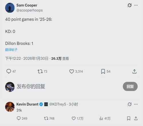 又有其他網(wǎng)友回復(fù)杜蘭特:“然而你生涯一場60+都沒有?!盞D繼續(xù)回懟:“Top 6(NBA總得分歷史前六)?!惫植坏枚盘m特不找女朋友,這時間全花在跟網(wǎng)友對線上面了。盡管本賽季KD在火箭最高分是39分,但死神得分能力毋庸置疑!