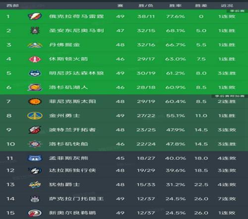 北京時間1月30日,今日的NBA常規(guī)賽結束了所有比賽,我們看看西部最新積分榜變動!雷霆111-123不敵森林狼,掘金107-103險勝籃網,太陽114-96戰(zhàn)勝活塞,獨行俠121-123憾負黃蜂,火箭104-86戰(zhàn)勝老鷹,國王111-113惜敗76人!