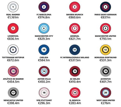德勤英國體育事業(yè)部(Sports Business Group of Deloitte UK)發(fā)布2026年度“足球財富排行榜”(Deloitte Football Money League 2026)。2025/25賽季又創(chuàng)下新紀(jì)錄,前20大俱樂部的總營收超過120億歐元。 皇家馬德里隊繼在2023/24財季成為首支單賽季收入達(dá)到10億歐元的足球俱樂部后,在2024/25賽季收入達(dá)到了11.6以哦元。其中,俱樂部通過商品銷售和贊助創(chuàng)造了5.94億歐元的收入。 榜單對各俱樂部2024/25賽季結(jié)束后的財務(wù)業(yè)績進(jìn)行分析,按照俱樂部的營收排出全球收入最高的30家足球俱樂部。 排名 俱樂部 所在地 賽季營收/同比增長 1、皇家馬德里(Real Madrid) 西班牙 11.61億歐元/+11% 2、巴塞羅那(FC Barcelona) 西班牙 9.748億歐元/+27% 3、拜仁慕尼黑(Bayern Munich) 德國 8.606億歐元/+12% 4、巴黎圣日耳曼(Paris Saint-Germain) 法國 8.37億歐元/+4% 5、利物浦(Liverpool) 英國 8.361億歐元/+17% 6、曼城(Manchester City) 英國 8.293億歐元/-1% 7、阿森納(Arsenal) 英國 8.217億歐元/+15% 8、曼聯(lián)(Manchester United) 英國 7.931億歐元/+3% 9、托特納姆熱刺(Tottenham Hotspur) 英國 6.726億歐元/+9% 10、切爾西(Chelsea) 英國 5.841億歐元/+7% 11、國際米蘭(FC Internazionale Milano) 意大利 5.375億歐元/+3% 12、多特蒙德(Borussia Dortmund) 德國 5.313億歐元/+3% 13、馬德里競技(Atletico de Madrid) 西班牙 4.545億歐元/+11% 14、阿斯頓維拉(Aston Villa) 英國 4.502億歐元/+45% 15、AC米蘭(AC Milan) 意大利 4.104億歐元/+3% 16、尤文圖斯(Juventus) 意大利 4.017億歐元/+13% 17、紐卡斯?fàn)柭?lián)隊(Newcastle United) 英國 3.984億歐元/+7% 18、斯圖加特(VFB Stuttgart) 德國 2.963億歐元/+79% 19、本菲卡(SL Benfica) 葡萄牙 2.834億歐元/+27% 20、西漢姆聯(lián)隊(West Ham United) 英國 2.76億歐元/-14% 21、加拉塔薩雷(Galatasaray) 土耳其 2.736億歐元 22、法蘭克福(Eintracht Frankfurt) 德國 2.699億歐元 23、布賴頓和霍夫阿爾比恩(Brighton & Hove Albion) 英國 2.378億歐元 24、埃弗頓(Everton) 英國 2.34億歐元 25、水晶宮(Crystal Palace) 英國 2.325億歐元 26、AFC伯恩茅斯(AFC Bournemouth) 英國 2.185億歐元 27、羅馬(AS Roma) 意大利 2.163億歐元 28、費(fèi)內(nèi)巴切(Fenerbahce) 土耳其 2.16億歐元 29、狼隊(Wolverhampton Wanderers) 英國 2.063億歐元 30、布倫特福德(Brentford) 英國 2.06億歐元 |