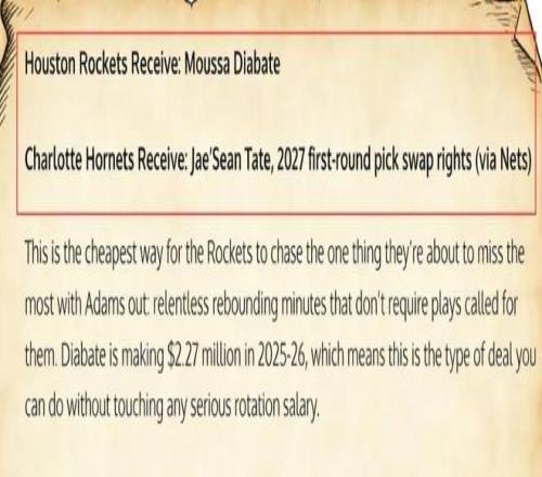 顯然,要想和雷霆、馬刺、掘金這樣的強(qiáng)隊(duì)抗衡,火箭仍需要在即將到來(lái)的交易市場(chǎng)上有所作為。尤其在亞當(dāng)斯賽季報(bào)銷之后,他們急需引入一位替補(bǔ)內(nèi)線。 在球隊(duì)管理層遲遲沒(méi)有動(dòng)靜的情況下,一些媒體、球迷紛紛開(kāi)始為他們出謀劃策。比如,美媒《Fadeaway World》便撰文建議,火箭可以將泰特以及2027年首輪簽的互換權(quán)(來(lái)自籃網(wǎng))送到黃蜂,換回迪亞巴特。