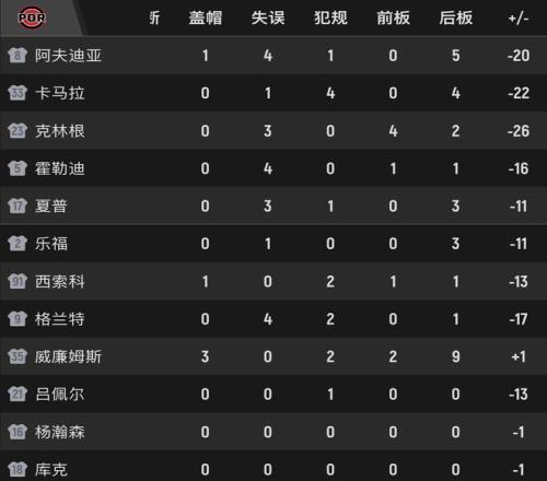 尼克斯隊本場7人得分上雙,其中布倫森砍下26分3次助攻,阿奴諾比24分6板3助,哈特20分6板5助,唐斯14分,外加20籃板3助攻。開拓者隊這邊夏普拿到26分,核心球員阿夫迪亞14投4中,僅得到11分??肆指鰬?zhàn)21分半鐘,只有7分6板的數(shù)據(jù),還出現(xiàn)了3次失誤,正負值負26,本場最低。