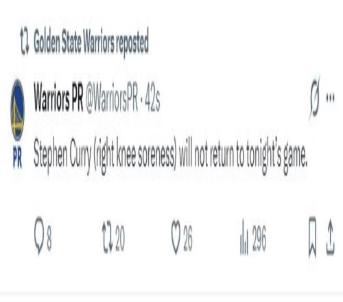 勇士官方:斯蒂芬-庫里的右膝仍有疼痛癥狀,他將缺席本場比賽的末節(jié)。 比賽回顧