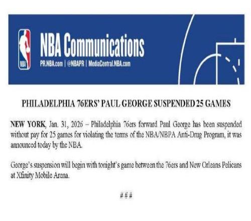 重磅!NBA官宣喬治違反禁藥政策禁賽25場損失1174萬美元已道歉