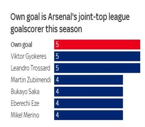 在隊內射手榜上,烏龍球、約克雷斯、特羅薩德以5球并列榜首,蘇比門迪、薩卡、埃澤、梅里諾以4球排名其后。在隊史上,阿森納本賽季也以5球追平了2023-24賽季,在阿森納隊史上僅次于2009-10(6球)。
