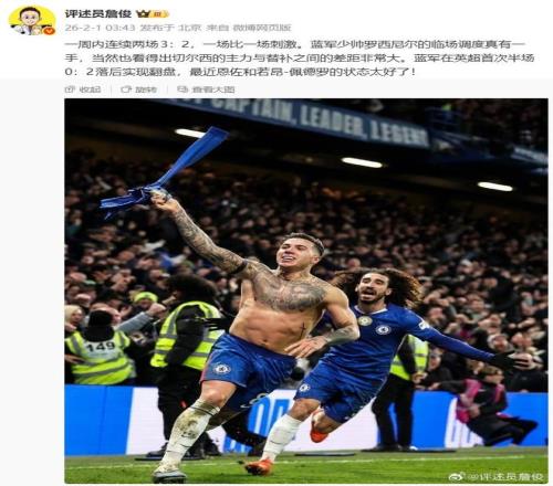 當恩佐在補時第92分鐘,將若昂·佩德羅的倒三角回傳轟入西漢姆聯(lián)球門時,斯坦福橋球場的聲浪仿佛要掀翻頂棚。從0-2到3-2,切爾西在英超歷史上57次半場落后至少兩球的絕境中,首次完成了不可思議的逆轉。這不僅僅是三分,也是羅塞尼爾對粉絲們的宣誓,他的確是有實力的新帥。正如賽后,社媒發(fā)文夸贊這新帥的詹俊談到:那支以鐵血意志和永不放棄精神著稱的藍軍,帶著昔日的斗志模式,正式回歸。