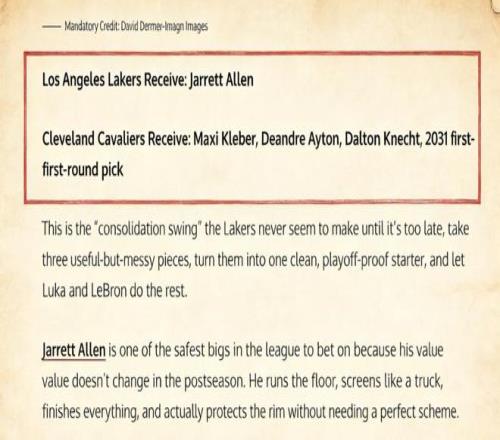 如果雙方選擇在交易截止日分道揚鑣,湖人都有哪些替換選擇呢? 美媒《Fadeaway World》撰文提出了一套4換1的交易方案,建議湖人將克萊伯、艾頓、克內克特以及2031年的首輪簽送到騎士,換回中鋒阿倫。