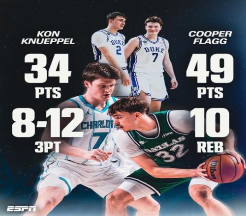 “我們兩個(gè)以后都會(huì)回味這一戰(zhàn),回味這一年,這段記憶將伴隨我們整個(gè)人生。能有這樣的機(jī)會(huì)真的很特別。”弗拉格賽后說(shuō)道。 克尼普爾則被問(wèn)到自己在最佳新秀榜上還領(lǐng)先弗拉格的問(wèn)題:“我們倆都想贏,但我們沒(méi)有聊這個(gè),這是一場(chǎng)精彩的比賽。我覺(jué)得他拿到49分10籃板之后應(yīng)該會(huì)在最佳新秀榜上反超我了,如果他最終拿獎(jiǎng),我會(huì)為他感到開(kāi)心的?!?/p> 這可不僅僅是兩位青年才俊惺惺相惜的故事,兩個(gè)人是實(shí)打?qū)嵉暮糜?,一年之前,他們還是睡在一個(gè)房間里的死黨。 上天注定的最佳新秀之爭(zhēng) 時(shí)間倒回2024年秋天,弗拉格和克尼普爾是杜克大學(xué)的兩名大一新生,二人同為五星高中生,證明著那一屆球隊(duì)的招募工作有多成功。 彼時(shí),弗拉格已經(jīng)是聞名全美的天才少年,夏天在拉斯維加斯舉行的美國(guó)男籃奧運(yùn)訓(xùn)練營(yíng)中,他與詹姆斯、庫(kù)里、濃眉等NBA巨星同場(chǎng)對(duì)抗,一戰(zhàn)成名。杜克大學(xué)總經(jīng)理瑞秋·貝克形容道:“弗拉格在旅程開(kāi)始之前就已經(jīng)被視為一個(gè)傳奇了?!?/p>