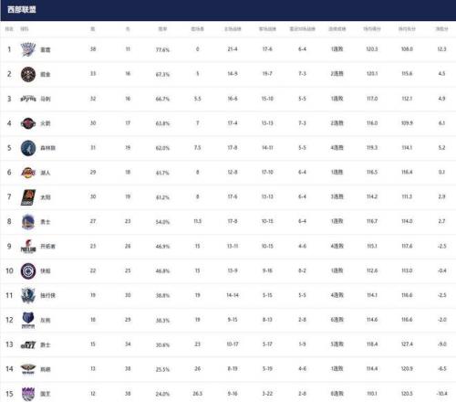 1-3名:雷霆(38勝11負)、掘金(33勝16負)、馬刺(32勝16負) 雷霆排名持續(xù)領跑,但在開局打出無解表現后,近期因傷病與狀態(tài)波動接連輸球,不僅讓他們確定無緣勇士隊72勝紀錄,也暴露出在爭冠團隊中他們并非是獨一檔的領跑者。 反而是掘金隊更加讓人期待,相比于過去幾個賽季,本賽季掘金隊通過小波特的交易實現陣容深度針對性補強,加上傷病潮爆發(fā)較早,又都在可控范圍之內,掘金與約基奇迎來沖擊第二冠的好機會。 馬刺隊則暴露出黑馬定位,無論是核心文班亞馬,還是全隊的穩(wěn)定性都存在一定問題,馬刺隊距離爭冠還需要一些時間打磨與調整,爆冷不敵黃蜂后拱手將第二位置讓給掘金隊,下個賽季預計才是這支馬刺與文班全面爆發(fā)的時間點。