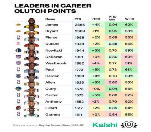 詹姆斯的關(guān)鍵時刻總得分歷史第一!勝率也是歷史第一!