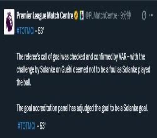 而英超官方也宣布,索蘭克對格伊的接觸不構(gòu)成犯規(guī),因?yàn)榍罢吲龅搅饲?。進(jìn)球認(rèn)證小組已經(jīng)判定該進(jìn)球是索蘭克的進(jìn)球。 可以說,這粒丟球直接讓曼城全隊(duì)心態(tài)出現(xiàn)波動(dòng),最終導(dǎo)致被扳平、痛失到手的勝利。