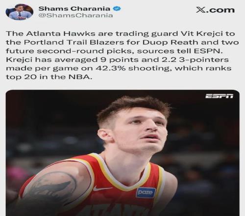 來了,第三筆交易達(dá)成。 爆料王Shams:老鷹將克雷伊奇送至開拓者,換回里斯+兩個次輪簽。