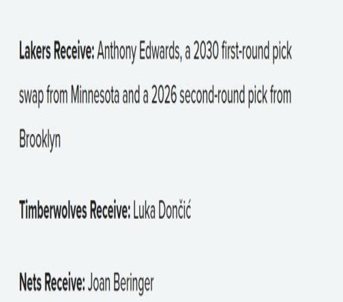 我們開篇就提到了這個方案。說實(shí)話,這筆交易對兩隊(duì)而言幾乎都是無稽之談,湖人和俄克拉荷馬城雷霆大概率都會直接拒絕。 東契奇本月將年滿27歲,是全聯(lián)盟第二出色的進(jìn)攻發(fā)動機(jī)(僅次于約基奇),常年穩(wěn)居MVP候選人之列。 亞歷山大只比他大一歲,本賽季有望沖擊生涯第二座MVP獎杯,而且已經(jīng)手握一枚總冠軍戒指。 兩人各有千秋:東契奇的傳球組織和籃板拼搶能力更勝一籌;亞歷山大則是效率更高的得分手,同時擁有更大的防守潛力。 無論去到哪支球隊(duì),兩人都能穩(wěn)居聯(lián)盟頂級球星行列。東契奇若加盟雷霆,球隊(duì)的防守體系能為他提供更堅(jiān)實(shí)的后盾;亞歷山大若身披湖人戰(zhàn)袍,他的“聯(lián)盟門面”價值無疑會水漲船高。 再說回這筆交易,兩隊(duì)大概率都會否決這個提案。不過考慮到雷霆正朝著衛(wèi)冕總冠軍的目標(biāo)穩(wěn)步前進(jìn),他們拒絕的態(tài)度恐怕會更加強(qiáng)硬——這也是為什么在這個假想方案里,需要湖人額外搭上一個首輪簽。 方案二:東契奇換愛德華茲 湖人得到:愛德華茲、森林狼2030年首輪簽互換權(quán)、籃網(wǎng)2026年次輪簽 森林狼得到:東契奇 籃網(wǎng)得到:約翰-貝林杰