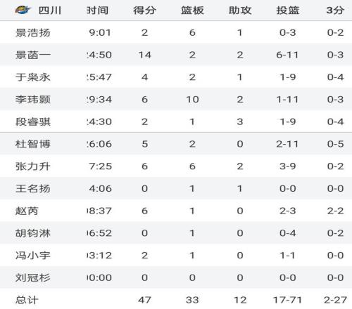 這場(chǎng)比賽,四川男籃真是刷新了職業(yè)球隊(duì)的下限,全隊(duì)12人,有11人上場(chǎng),結(jié)果就景菡一1人得分上雙,其他人的命中率完全可以用慘不忍睹來形容,下面是本場(chǎng)比賽四川隊(duì)的賽后數(shù)據(jù):全場(chǎng)投籃71次,但是只命中17球,命中率僅為23.9%,其中球隊(duì)三大首發(fā)于梟永投籃9中1,李瑋顥投籃11中1,段睿騏9中1,三大主力合計(jì)29中3,命中率剛過10%。此外,四川這場(chǎng)全隊(duì)三分27中2,命中率僅為7.4%,要知道,很多都是空位三分,結(jié)果就投出這樣的命中率,著實(shí)有些離譜。