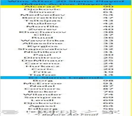 最讓人驚訝的是,阿卡僅僅用了20站大滿貫賽就實現(xiàn)了這個目標。放眼歷史,生涯前20站大滿貫勝場榜中,阿卡位列現(xiàn)役第一,歷史上則暫時僅次于兩位上古大神麥肯羅(91)和博格(98)。且看具體排行: 在現(xiàn)役球員中,阿卡幾乎是斷層般的存在,即便在他身后的是德約和辛納,他領先這兩位主要對手幾乎將近30個場次。