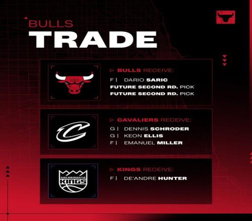 騎士得到:基翁-埃利斯、丹尼斯-施羅德、伊曼紐爾-米勒 國(guó)王得到:德安德烈-亨特 公牛得到:達(dá)里奧-薩里奇、2027年次輪簽、2029年次輪簽 為了完成這筆交易,公牛裁掉了杰文-卡特,騎士裁掉了盧克-特拉弗斯。