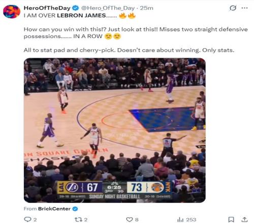 著名詹黑媒體賽后吐槽勒布朗的防守(正好就是湖人第三節(jié)崩盤的開始):我對勒布朗-詹姆斯已經(jīng)厭倦了,他這樣打球怎么可能贏?看看這個瞬間吧,連續(xù)兩個防守回合都漏人,他只顧著刷數(shù)據(jù)、挑有利數(shù)據(jù)的位置,他根本不在乎輸贏,只在乎數(shù)據(jù)。