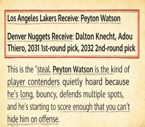美媒《Fadeaway World》便提出了一套4換1的交易方案—— 湖人送出:克內(nèi)克特、蒂耶羅、2031年首輪簽、2032年次輪簽 掘金送出:沃特森
