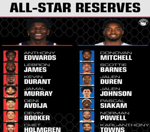 在西部分區(qū),入選的全明星替補(bǔ)球員有明尼蘇達(dá)森林狼隊(duì)的愛德華茲、洛杉磯湖人隊(duì)的詹姆斯、休斯頓火箭隊(duì)的杜蘭特、丹佛掘金隊(duì)的穆雷、波特蘭開拓者隊(duì)的阿夫迪亞、菲尼克斯太陽隊(duì)的布克和俄克拉荷馬城雷霆隊(duì)的霍姆格倫。 在東部分區(qū),入選的全明星替補(bǔ)球員有克利夫蘭騎士隊(duì)的米切爾、多倫多猛龍隊(duì)的巴恩斯、底特律活塞隊(duì)的杜倫、亞特蘭大老鷹隊(duì)的杰倫-約翰遜、印第安納步行者隊(duì)的西亞卡姆、邁阿密熱火隊(duì)的鮑威爾和紐約尼克斯隊(duì)的唐斯。 這樣一來,沒有入選首發(fā)陣容的詹姆斯和杜蘭特都進(jìn)入替補(bǔ)陣容,他們還是很有人氣的老球星,可以繼續(xù)跟庫里一起打全明星正賽。阿夫迪亞、穆雷、霍姆格倫、杰倫-約翰遜、杜倫和巴恩斯等球員都是第一次入選全明星正賽陣容,NBA的全明星也在更新?lián)Q代。 不過令人意外的是,倫納德和哈登都沒有入選全明星正賽陣容,他們都是洛杉磯快船隊(duì)的核心球員,也是東道主球員,因?yàn)榻衲闚BA全明星由快船隊(duì)承辦。