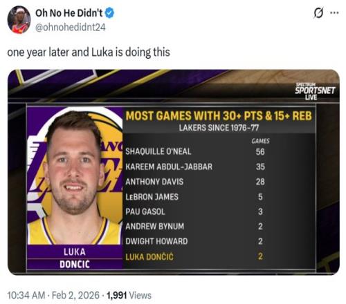 詹東空砍52+20+14 湖人雖然輸?shù)舯荣?,詹姆斯與東契奇雙核卻依舊交出華麗數(shù)據(jù),其中東契奇出戰(zhàn)37分鐘,23中10,三分14中5,轟下全場(chǎng)最高的30分,外加15板8助。 憑借這樣的表現(xiàn),東契奇湖人生涯第二次單場(chǎng)交出至少30分15板,成功追平拜納姆與霍華德并列隊(duì)史第六,奧尼爾56次第一、賈巴爾35次第二、濃眉哥28次第三、詹姆斯5次第四、大加索爾3次第五。 只不過,東契奇實(shí)際上的籃板球貢獻(xiàn)遠(yuǎn)沒有數(shù)據(jù)那么亮眼,因?yàn)樗蟛糠只@板都是后場(chǎng)籃板,過去8場(chǎng)東契奇一共搶下72個(gè)籃板球,其中只有1個(gè)是前場(chǎng)籃板。