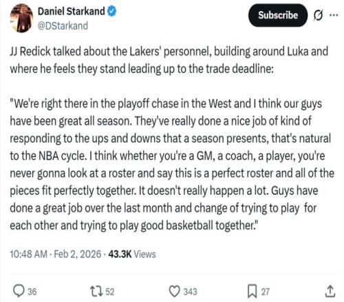 第二大問題是捉襟見肘的陣容深度,全場(chǎng)湖人僅4人得分上雙,除東契奇與詹姆斯之外,只有艾頓13分與八村11分,其余球員的貢獻(xiàn)十分有限。 并且就目前的情況來看,湖人隊(duì)大概率不會(huì)在截止日前有大手筆的操作,雷迪克賽后被問到相關(guān)問題時(shí)也給出類似答案。 雷迪克表示沒有完美的球隊(duì),目前湖人還處于不錯(cuò)的位置,過去一個(gè)月球隊(duì)的表現(xiàn)也很棒。