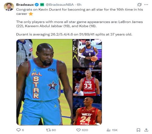 火記Bradeaux寫道,杜蘭特生涯第16次進入全明星,杜蘭特全明星次數(shù)歷史第四,僅次于詹姆斯22次,賈巴爾19次,科比18次。