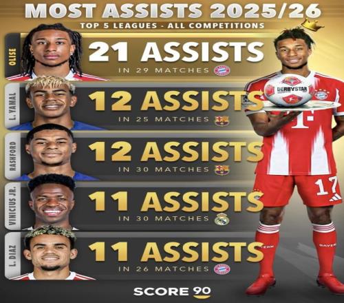 2025/26賽季助攻最多(五大聯(lián)賽 | 所有賽事)奧利塞 | Michael Olise 國籍:法國 當(dāng)季效力俱樂部:拜仁慕尼黑 助攻:21次 出場:29場 場均助攻:0.72 亞馬爾 | Lamine Yamal 國籍:西班牙 當(dāng)季效力俱樂部:巴塞羅那 助攻:12次 出場:25場 場均助攻:0.48