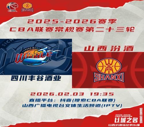 北京時間2026年2月3日19:35,2025-2026賽季CBA聯(lián)賽常規(guī)賽第23輪繼續(xù)進行,山西汾酒客場挑戰(zhàn)四川豐谷酒業(yè),球迷觀眾可以通過抖音(搜索CBA聯(lián)賽)、山西廣播電視臺文體生活頻道(IPTV)觀看比賽實況,與我們一同為山西汾酒男籃加油助威!