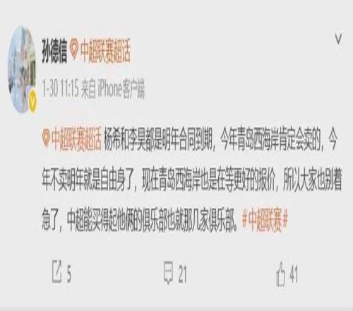 根據(jù)媒體人的透露,青島西海岸隊打算在今年將李昊賣出,因為李昊與俱樂部的合同明年到期,今年不賣,明年就會變成自由之身。西海岸隊現(xiàn)在在等一個好的報價。 此前,《北青體育》透露,李昊已經(jīng)引起英超豪門切爾西的關(guān)注,這也讓不少球迷憧憬李昊能像徐彬一樣,繼續(xù)走出去留洋。但是從徐彬轉(zhuǎn)會狼隊的細節(jié)來看,李昊的留言計劃,基本上已經(jīng)破滅了。原因主要有以下2點。