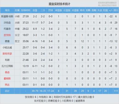卡森-華萊士三分11中7砍下27分6板2斷,得分和三分命中數(shù)都是生涯最高。掘金全場(chǎng)比賽從未領(lǐng)先過(guò),此役過(guò)后跌至西部第三。最后看看數(shù)據(jù):