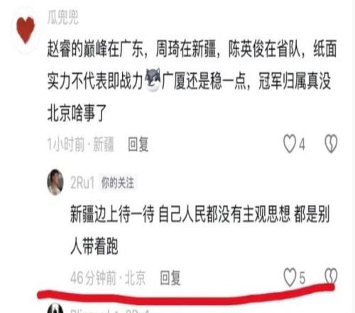 北京男籃在主場不敵青島男籃,這場比賽是球隊歷史上首次在主場輸給對手。比賽結束后,很多北京球迷都表達了對球隊表現(xiàn)的不滿,也有不少球迷喊話主教練許利民下課。有新疆球迷在社交媒體上發(fā)表了自己的看法,認為趙睿、周琦、陳盈駿等球員都過了巔峰期,冠軍歸屬真沒北京男籃啥事。這位新疆球迷的表達引發(fā)了趙睿的關注,他在下面進行了留言,但卻引發(fā)了球迷的不滿,不少球迷紛紛打電話進行舉報。