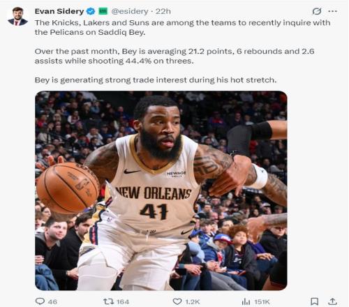 根據(jù)《福布斯體育》記者埃文-斯迪瑞的報道,尼克斯、湖人、太陽正在追逐鵜鶘前鋒薩迪克-貝,過去一個月里貝場均21.2分6籃板2.6助攻,三分命中率高達44.4%,貝的火熱狀態(tài)引發(fā)了交易討論。