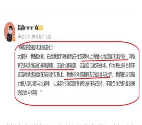 2月2日,晚上9點!北京隊球員趙睿,通過網(wǎng)絡(luò)平臺發(fā)文,正式向球迷進(jìn)行道歉!