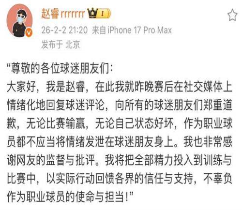 面對洶涌輿情,趙睿在24小時內(nèi)火速更新社交動態(tài),公開致歉:“昨晚賽后在社交媒體上情緒化地回復(fù)球迷評論,向所有球迷朋友們鄭重道歉。無論比賽輸贏,無論自己狀態(tài)好壞,作為職業(yè)球員,都不應(yīng)將情緒發(fā)泄在球迷身上。”言辭誠懇,態(tài)度明確。這一及時止損的舉動,雖未能完全平息爭議,但至少展現(xiàn)了職業(yè)球員應(yīng)有的擔(dān)當(dāng)。