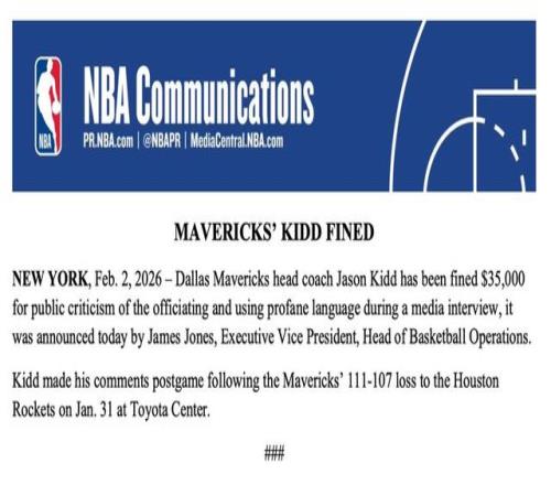 北京時間2月3日,NBA官方宣布,獨行俠隊主教練杰森-基德因在媒體采訪中公開批評裁判執(zhí)法并使用污言穢語,被處以35000美元罰款。