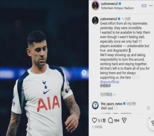 北京時間2月3日,在熱刺2-2艱難戰(zhàn)平曼城之后,隊長羅梅羅更新社交媒體。這位阿根廷中衛(wèi)不僅解釋了自己因何被換下場,同時也對熱刺管理層在冬窗轉(zhuǎn)會市場上引援不力進行了挖苦。白百合軍團在多達9名一線隊球員缺陣的情況下,從兩球落后的劣勢中扳平比分,拿到了提升英超排名路上的關(guān)鍵一分。