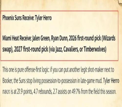 美媒《Fadeaway World》撰文建議,太陽(yáng)隊(duì)可以將格林、鄧恩、2026年及2027年的首輪簽送到熱火,換回希羅。