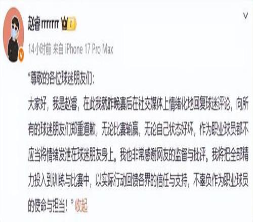 雖然已經(jīng)公開做出道歉,但趙睿并沒有完全平息球迷的憤怒,因為整個內(nèi)容里只提到“向所有的球迷朋友們鄭重道歉,……作為職業(yè)球員都不應(yīng)當將情緒發(fā)泄在球迷朋友身上?!?,對于新疆球迷只字未提,這和他之前有針對性的言論存在偏差。